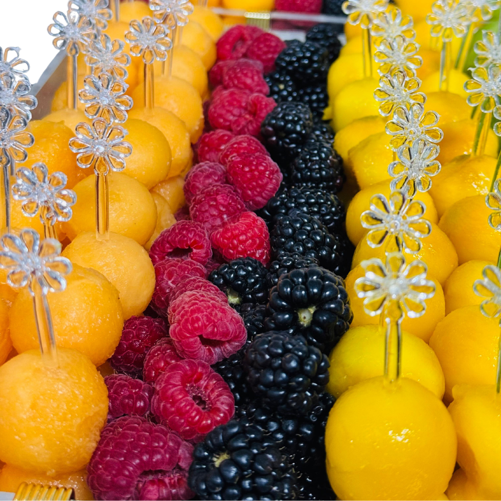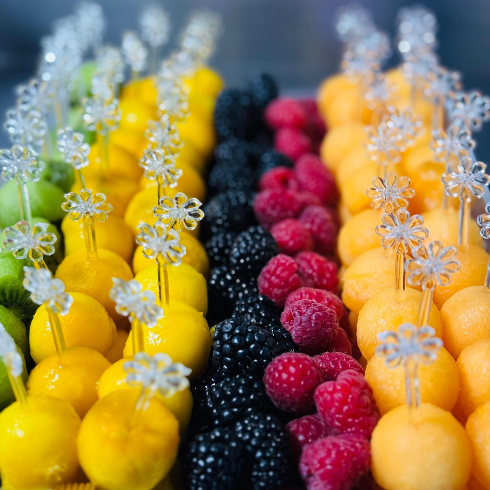 A beautifully organized tray of perfectly scooped melon, kiwi, and fresh berries, individually served on elegant, flower-topped acrylic skewers.